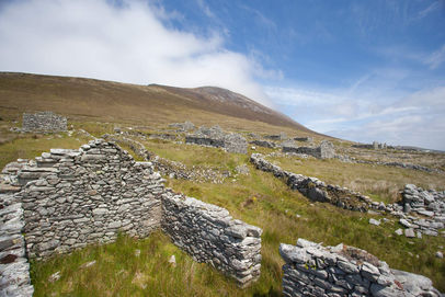 The ferry lands at the tiny pier on Cloughmore, Achill Island. The cycle to Achill Sound is along quiet roads in typical west of Ireland scenery. To your right as you start your journey is Kildavnet, another of Granuaile’s tower houses which are dotted around the bay. Kildavnet is also the name of the nearby church and adjacent graveyard where many victims of the Potato Famine of the mid 1800s were buried in unmarked graves. Almost immediately after that is the RNLI lifeboat station; the navy and orange lifeboat is a familiar sight in these waters. You also cycle past The Secret Garden at Bleanaskill Lodge.